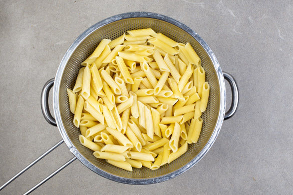 Die Pasta in das kochende Wasser geben und in 7–9Min. bissfest kochen. In ein Sieb abgießen und abtropfen lassen.