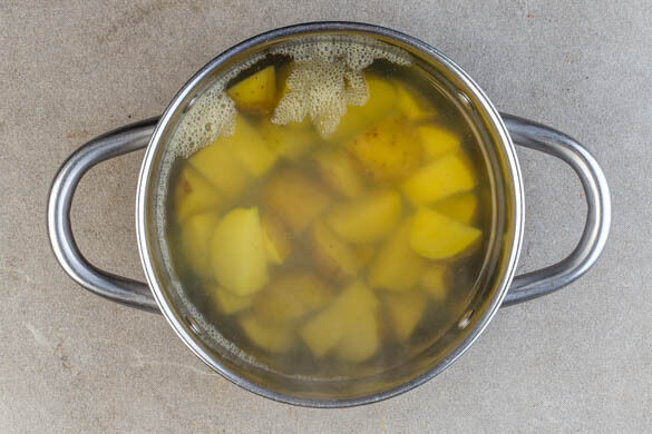 In einem mittelgroßen Topf ausreichend gesalzenes Wasser für die Kartoffeln zum Kochen bringen. Die Kartoffeln je nach Größe halbieren, in das kochende Wasser geben und in 10–12Min. gar kochen, dann in ein Sieb abgießen.