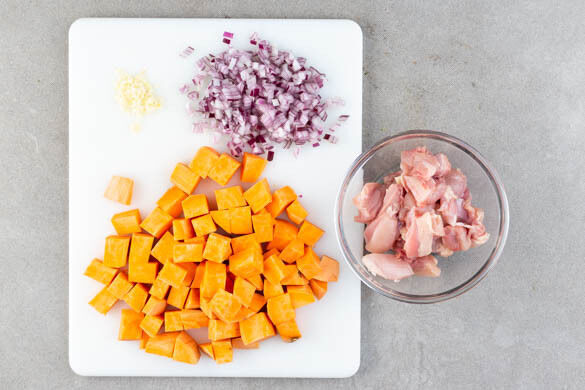 Den Backofen auf 220°C (200°C Umluft) vorheizen. Die Süßkartoffeln schälen und in 2–3cm große Würfel schneiden. Die Zwiebeln und den Knoblauch schälen und fein würfeln. Das Fleisch trocken tupfen und in 2–3cm große Stücke schneiden.