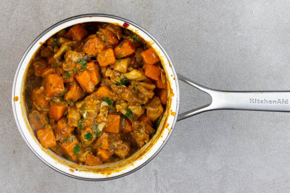 Die Zwiebeln und den Knoblauch in einem großen Topf mit 2EL Butter bei mittlerer bis starker Hitze ca. 1Min. anbraten. Die Süßkartoffeln, das Fleisch, die Gewürzmischung und 1TL Salz hinzufügen und ca. 2Min. mitbraten. 150–200ml Wasser angießen und abgedeckt aufkochen, dann die Süßkartoffeln bei mittlerer bis niedriger Hitze 7–10Min. köcheln lassen, bis sie gar sind.
