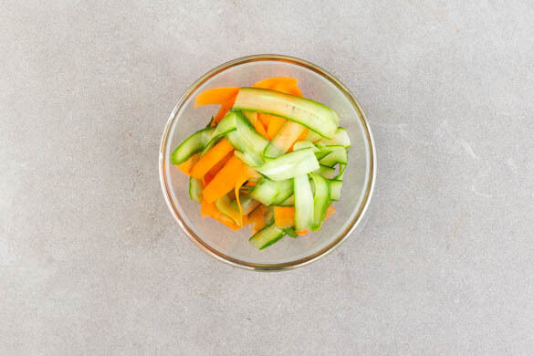 Die Karotten ggf. schälen, dann die Karotten und die Gurken mit einem Sparschäler rundum in lange, breite Streifen schneiden.