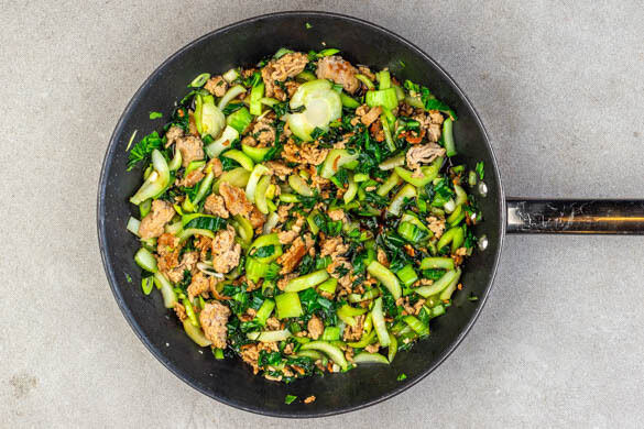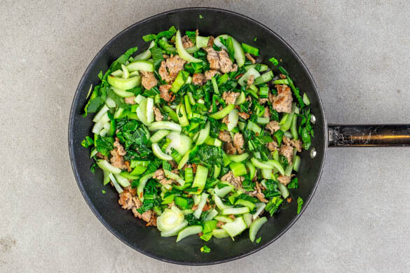 Das Hackfleisch in einer großen Pfanne mit 2TL Pflanzenöl bei mittlerer Hitze 4–5Min. goldbraun anbraten. Den Pak Choi längs halbieren und quer in feine Streifen schneiden, in die Pfanne geben und 3–4Min. mitbraten.