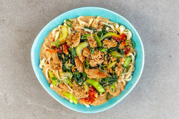 Unsere kulinarische Reise führt uns heute nach China, wo dieser Klassiker herkommt, in dem scharfe, süße und nussige Aromen perfekt zusammenfinden. Saftiges Schweinehackfleisch, leckere Vollkorn-Mie-Nudeln und zarter Pak Choi sind die Hauptkomponenten. Übrigens: Der Name „Dan Dan“ kommt von den Tragestangen, auf denen die Straßenverkäufer traditionell ihre Nudeltöpfe befestigt haben.