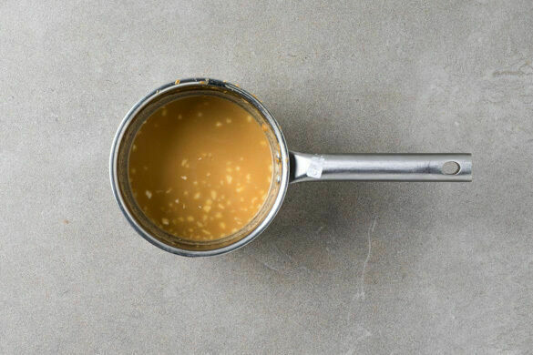 Den Knoblauch schälen und fein würfeln. Die ½ des Knoblauchs mit der Erdnussbutter und 2EL Sojasauce in einem kleinen Topf verrühren. Bei mittlerer Hitze nach und nach insgesamt 250ml heißes Wasser zugeben und alles zu einer glatten Sauce verrühren.