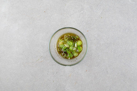 Den Backofen auf 220°C (200°C Umluft) vorheizen. Die Zwiebel schälen, halbieren und in feine Würfel schneiden. Den Knoblauch schälen und fein würfeln. Die Tomaten in kleine Würfel schneiden. Den Salat in feine Streifen schneiden, dabei den Strunk entfernen. Die Lauchzwiebeln in feine Ringe schneiden.