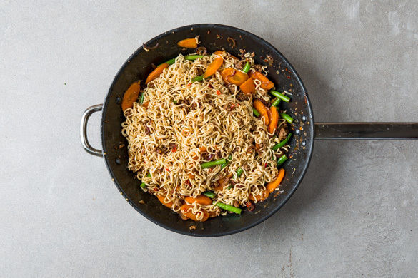 Diese schnelle Nudelpfanne macht doppelt glücklich! Zum einen ist die Kombination mit Rinderhack, buntem Gemüse, Vollkorn-Mie-Nudeln und einer würzigen Sauce richtig lecker. Und dann ist da noch die feine Schärfe von Peperoni – wusstest du, dass durch sie Glückshormone, die sogenannten Endorphine, ausgeschüttet werden? Diese wirken entspannend auf unseren Körper. Da langen wir doch doppelt gerne zu!