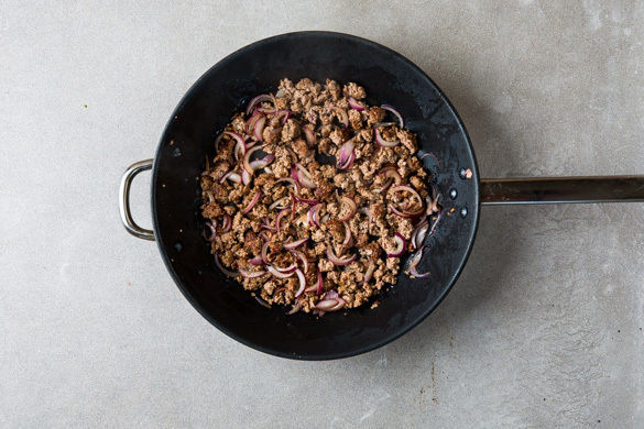 Inzwischen das Hackfleisch und die Zwiebeln in einer großen Pfanne mit 1EL Pflanzenöl bei starker Hitze ca. 2Min. scharf anbraten. Dabei das Hackfleisch mit einem Pfannenwender krümelig zerdrücken.