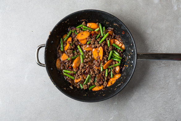 Die Karotten und die Bohnen dazugeben und 3Min. in der Pfanne schwenken, dann die Hitze reduzieren und mit der Sauce ablöschen. Das Fleisch und das Gemüse abgedeckt 7–8Min. köcheln lassen. Tipp: Wer das Gemüse weniger knackig mag, gibt danach ca. 2EL Wasser hinzu und verlängert die Kochzeit um 2–3Min.