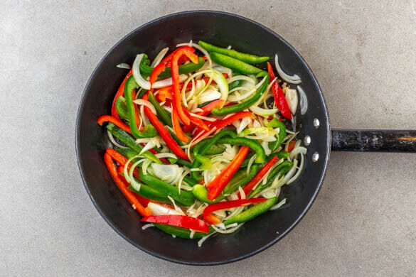 Das Hackfleisch in die Pfanne geben, mit je 1 kräftigen Prise Salz und Pfeffer würzen und in 3–4Min. krümelig anbraten. Dann die Hitze erhöhen und 5–7Min. weiterbraten, bis die Paprikastreifen weich werden.