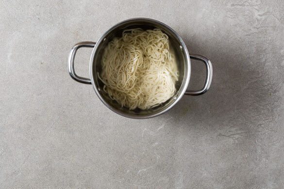 Die Nudeln in das kochende Wasser geben und in ca. 4Min. bissfest kochen. Mit einer Tasse etwas Nudelwasser abschöpfen, dann die Nudeln in ein Sieb abgießen und zurück in den Topf geben.