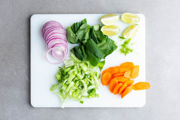Die Zwiebel schälen und in dünne Ringe schneiden. Den weißen Teil des Pak Choi in dünne Streifen schneiden, den grünen Teil grob zerschneiden. Die Limettenschale fein abreiben, dann die Limette in Spalten schneiden. Die Karotten ggf. schälen und in dünne Scheiben schneiden.