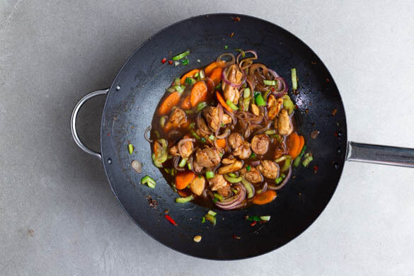 Das Fleisch in einer großen Pfanne oder einem Wok mit 1EL Pflanzenöl bei mittlerer Hitze 2–3Min. goldbraun anbraten. Auf einem Teller beiseitestellen, die Pfanne auswischen.