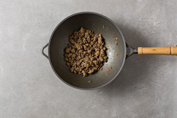 Das Hackfleisch in einem Wok oder einer großen Pfanne mit 1EL Pflanzenöl bei starker Hitze 4–5Min. scharf anbraten, herausnehmen und beiseitestellen. Die Lauchzwiebel schräg in feine Ringe schneiden.