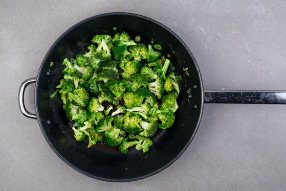 Den Brokkoli in der Pfanne mit 2EL Pflanzenöl bei mittlerer bis starker Hitze 2–3Min. anbraten. Mit 2–4EL Wasser ablöschen und abgedeckt in 3–5Min. bei mittlerer Hitze bissfest garen. Tipp: Wer den Brokkoli etwas weicher mag, gart ihn etwas länger, dann ggf. noch etwas Wasser hinzufügen. Die Lauchzwiebeln zugeben und 1–2Min. mitgaren.