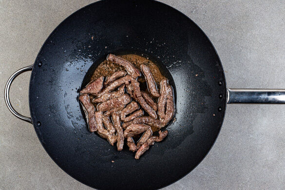 Das Fleisch trocken tupfen und in einer großen Pfanne oder einem Wok mit 1TL Pflanzenöl bei starker Hitze 1–2Min. scharf anbraten. Herausnehmen und auf einem Teller beiseitestellen.