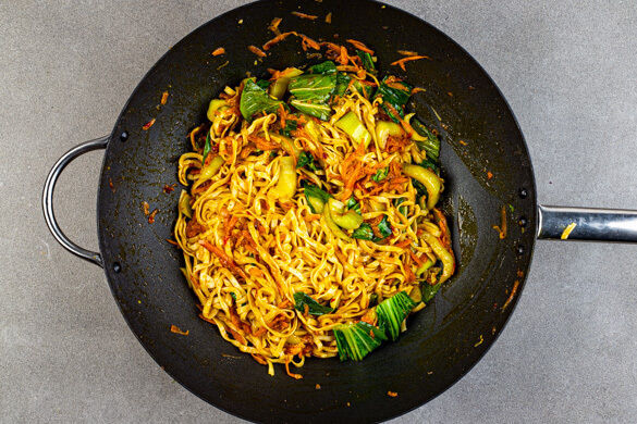 Die Hitze auf die niedrigste Stufe reduzieren, die Blätter des Pak Choi und die Nudeln hinzugeben und ca. 1Min. schwenkend braten, dabei löffelweise Nudelwasser hinzufügen, bis die Nudeln schön glänzen und alles gut vermischt ist. Mit dem Limettensaft, dem Sesamöl sowie Salz und Pfeffer abschmecken.