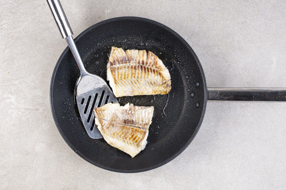 Den Fisch mit kaltem Wasser abspülen, trocken tupfen und evtl. vorhandene Gräten mit einer Pinzette entfernen. In einer großen Pfanne mit 2EL Olivenöl bei mittlerer Hitze auf jeder Seite ca. 3Min. braten, bis der Fisch gar ist. Mit Salz und Pfeffer würzen, aus der Pfanne nehmen und warm halten.