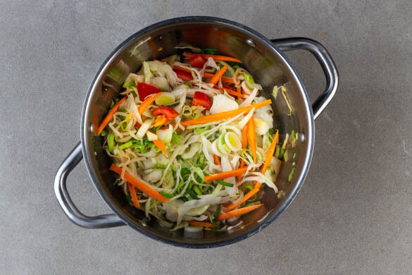 Die ½ des Brühgewürzes, die ½ der Sojasauce und 1 kräftige Prise Pfeffer mit 800ml Wasser in den Topf geben und zum Kochen bringen. Das Gemüse bei mittlerer Hitze in 8–10Min. weich köcheln.