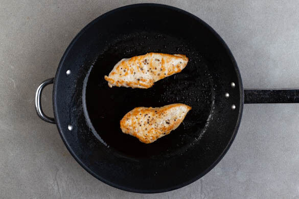 Das Fleisch trocken tupfen, längs halbieren und von beiden Seiten mit je 1 kräftigen Prise Salz und Pfeffer würzen. In einer mittelgroßen Pfanne mit 1EL Pflanzenöl bei starker Hitze 3–4Min. auf jeder Seite braten, bis das Fleisch goldbraun und gar ist. Das Fleisch herausnehmen und beiseitestellen, die Pfanne aufbewahren.
