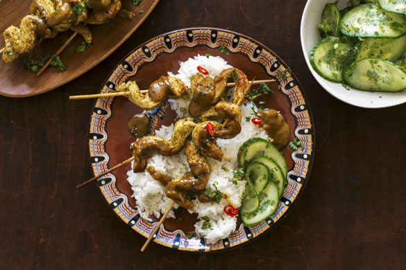 Die Hähnchenspieße mit dem Reis anrichten und mit der Erdnusssauce und den Chilistreifen nach Geschmack garnieren. Mit dem Gurkensalat servieren.