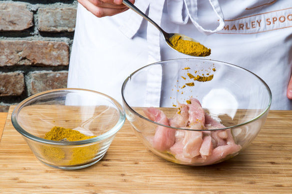 Den Backofen mit Grillfunktion auf 250°C vorheizen. Den Koriander samt Stängeln fein schneiden. Den Ingwer und den Knoblauch schälen und fein schneiden oder reiben. Die Chilischote längs halbieren, entkernen und in feine Streifen schneiden. Das Fleisch trocken tupfen, in ca. 1cm breite Streifen schneiden und mit 1EL Gewürzmischung, etwas Salz und 1EL Pflanzenöl einreiben.