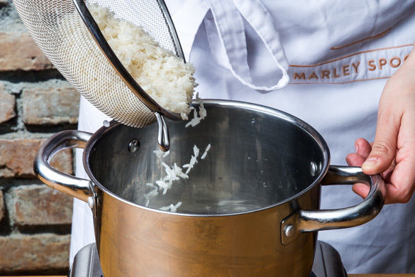In einem mittelgroßen Topf 300ml leicht gesalzenes Wasser zum Kochen bringen. Den Reis in einem Sieb unter fließendem Wasser abspülen, bis das Wasser klar bleibt. Sobald das Wasser kocht, den Reis hineingeben und abgedeckt bei niedrigster Hitze 10–12Min. kochen, bis das Wasser aufgesogen und der Reis gar ist. Noch ca. 5Min. ohne Hitzezufuhr ziehen lassen.