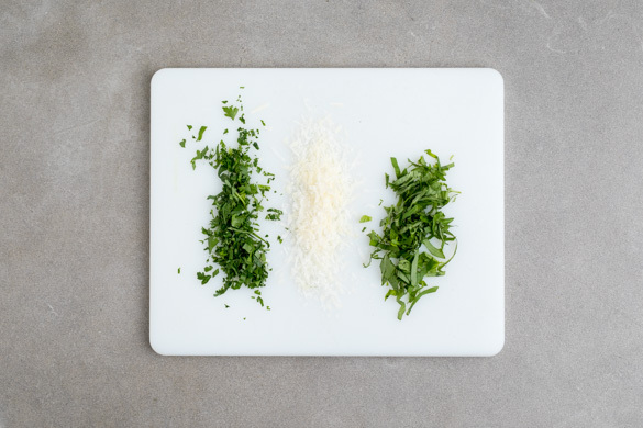 Die Basilikumblätter abzupfen und grob schneiden. Die Petersilie samt Stängeln grob hacken. Den Käse fein reiben.