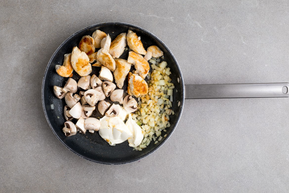 Die Zwiebeln in der Pfanne mit 1EL Olivenöl bei mittlerer Hitze 1–2Min. glasig anbraten. Die Sahne unterrühren, dann die Pilze, das Fleisch und die ½ des Käses hinzugeben und alles gut verrühren. Die Sauce noch 2–3Min. sanft köcheln lassen.