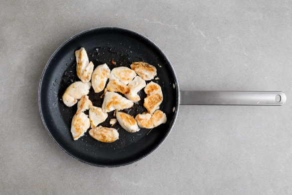 Das Fleisch trocken tupfen, in 1–2cm dünne Scheiben schneiden und mit 1/2TL Salz sowie 1 kräftigen Prise Pfeffer würzen. In einer großen Pfanne mit 1EL Olivenöl bei starker Hitze 2–3Min. rundum scharf anbraten, dann aus der Pfanne nehmen und auf einem Teller beiseitestellen. Die Pfanne aufbewahren.