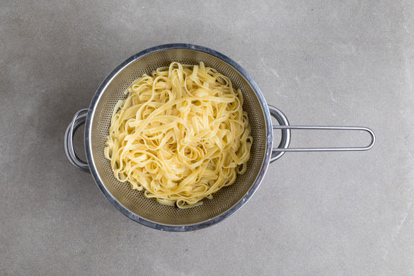 Die Pasta in das kochende Wasser geben und in 7–9Min. bissfest kochen. Mit einer Tasse etwas Pastawasser abschöpfen, dann die Pasta in ein Sieb abgießen und abtropfen lassen.
