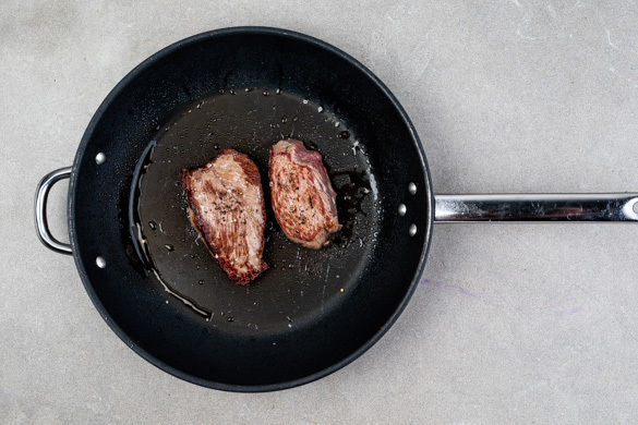 Das Fleisch trocken tupfen und von beiden Seiten mit je 1 Prise Salz und Pfeffer würzen. In einer großen Pfanne mit 2EL Olivenöl bei starker Hitze auf jeder Seite 1–2Min. scharf anbraten, dann auf einem Teller abgedeckt beiseitestellen und warm halten. Die Pfanne nicht auswischen.