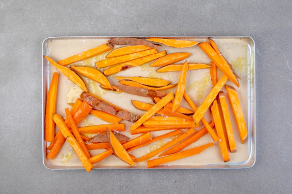 Den Backofen auf 240°C (220°C Umluft) vorheizen. Die Karotte ggf. schälen und in in fingerlange, ca. 1cm dicke Stifte schneiden. Die Süßkartoffeln samt Schale erst in 1cm breite Scheiben und dann ebenfalls in fingerlange, ca. 1cm dicke Stifte schneiden.