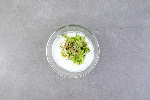 Den Knoblauch schälen und in möglichst kleine Würfel schneiden oder fein reiben. Die Gurke mit einer Küchenreibe grob raspeln. Den Joghurt mit dem Knoblauch und den Gurkenraspeln verrühren und das Tzatziki mit Salz und Pfeffer abschmecken.