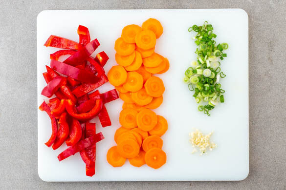 In einem mittelgroßen Topf ausreichend gesalzenes Wasser für Nudeln zum Kochen bringen. Die Paprika vierteln, entkernen und quer in ca. 1cm breite Streifen schneiden. Die Karotte ggf. schälen und in dünne Scheiben schneiden. Die Lauchzwiebel fein hacken. Den Knoblauch schälen und fein reiben oder sehr fein würfeln.