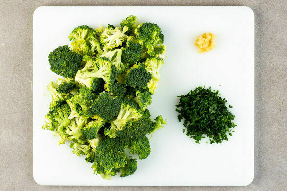 Den Brokkoli in mundgerechte Röschen schneiden, den Strunk ggf. schälen und in dünne Scheiben schneiden. Den Knoblauch schälen und fein reiben. Die Petersilie samt Stängeln fein schneiden.