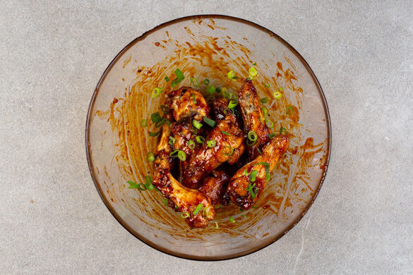 Den Topf auswischen und darin den Knoblauch, die Sojasauce, die Chilipaste, das restliche Sesamöl, 3EL Wasser, 2EL Essig und 2EL (braunen) Zucker verrühren. Bei mittlerer Hitze unter Rühren aufköcheln und in 3–5Min. leicht eindicken lassen, anschließend vom Herd nehmen und beiseitestellen.