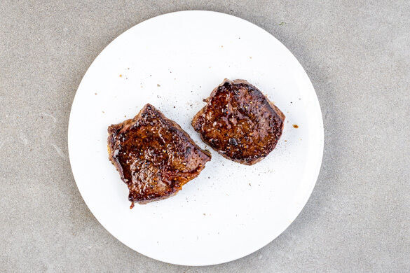 Das Fleisch trocken tupfen und in derselben Pfanne mit 2EL Olivenöl bei starker Hitze auf jeder Seite 2–3Min. braten, abhängig davon, ob es medium oder eher durchgebraten sein soll.