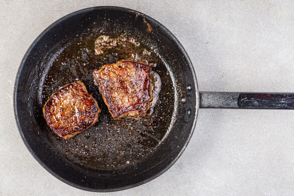 Das Fleisch trocken tupfen und in derselben Pfanne mit 1EL Olivenöl bei starker Hitze auf jeder Seite 2–3Min. braten, abhängig davon, ob es medium oder eher durchgebraten sein soll.
