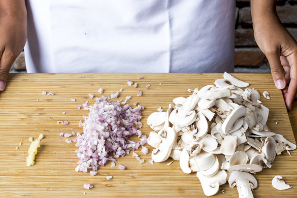 In einem großen Topf ausreichend gesalzenes Wasser für die Pasta zum Kochen bringen. Inzwischen die Pilze ggf. säubern und in dünne Scheiben schneiden. Die Schalotten und den Knoblauch schälen und fein würfeln.