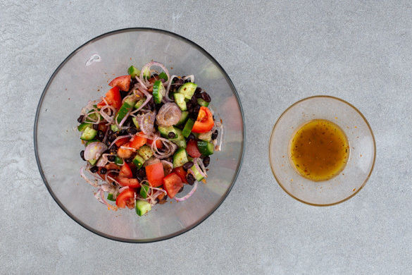 Aus 1TL Olivenöl, 1TL Essig, 1TL Gewürzmischung sowie je 1 Prise Salz und Pfeffer ein Dressing anrühren.