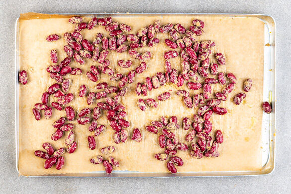 Die Bohnen in einem Sieb kalt abspülen und abtropfen lassen, dann mit der ½ der Hefeflocken und 2EL Olivenöl auf einem mit Backpapier ausgelegten Backblech vermengen und im Ofen in ca. 15Min. knusprig backen.
