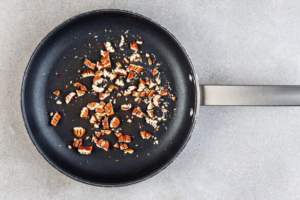 Die Pekannüsse grob hacken und in einer mittelgroßen Pfanne ohne Zugabe von Fett bei mittlerer bis niedriger Hitze 2–3Min. goldbraun anrösten. Vorsicht, sie können schnell zu dunkel werden. Zum Abkühlen aus der Pfanne nehmen und beiseitestellen.