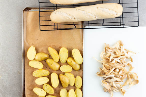 Die Kartoffeln samt Schale längs halbieren, auf einem mit Backpapier ausgelegten Backblech mit 2EL Olivenöl und 1 kräftigen Prise Salz und Pfeffer einreiben, dann gleichmäßig auf einer Seite des Backblechs verteilen und im Ofen 10–15Min. backen. Die Brötchen auf einem Backrost im Ofen 4–5Min. aufbacken. Die Pilze in mundgerechte Streifen zupfen.