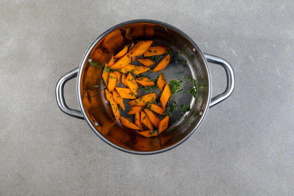 Die Karotten in einem mittelgroßen Topf in ausreichend leicht gesalzenem Wasser 2–3Min. bissfest kochen. Die Petersilienblätter abzupfen und fein hacken. Die gekochten Karotten in ein Sieb abgießen, zurück in den Topf geben und mit der Petersilie vermengen.