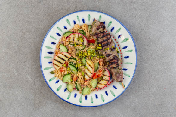 Die Lammspieße mit den Nektarinen und den Pistazien auf dem Couscoussalat anrichten. Ggf. übrigen Zitronensaft über die Spieße träufeln und servieren.