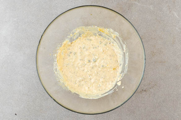 Die Zitronenschale abreiben, dann die Zitrone halbieren und auspressen. Den Knoblauch schälen und fein würfeln. Die Kapern grob schneiden. Die ½ des Käses fein reiben. Den Joghurt mit der Zitronenschale, 2TL Zitronensaft, dem Knoblauch, den Kapern, dem Käse, der ½ der Sojasauce, 1EL Senf, 1EL Olivenöl und 1 kräftigen Prise Pfeffer vermengen.
