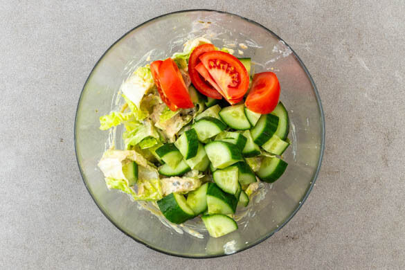 Die Gurke längs vierteln und in ca. 2cm große Würfel schneiden. Die Tomaten in Spalten schneiden. Die Gurken und die Tomaten mit dem Salat vermengen, abschmecken und ggf. mit Salz und Pfeffer nachwürzen.