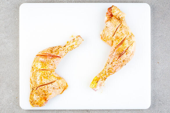 Den Backofen auf 230°C (210°C Umluft) vorheizen. Den Ahornsirup mit der ½ der Gewürzmischung, 1TL Olivenöl und 1 Prise Salz verrühren. Die Hähnchenschenkel trocken tupfen und 2–3-mal bis zu den Knochen einschneiden, dann mit dem Gewürzsirup einreiben.