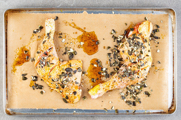 Die Kürbiskerne fein hacken, auf einem Teller verteilen und die Hähnchenschenkel von beiden Seiten in den Kürbiskernen wenden. Auf ein mit Backpapier ausgelegtes Backblech geben und ca. 15Min. auf der untersten Schiene im Ofen backen.