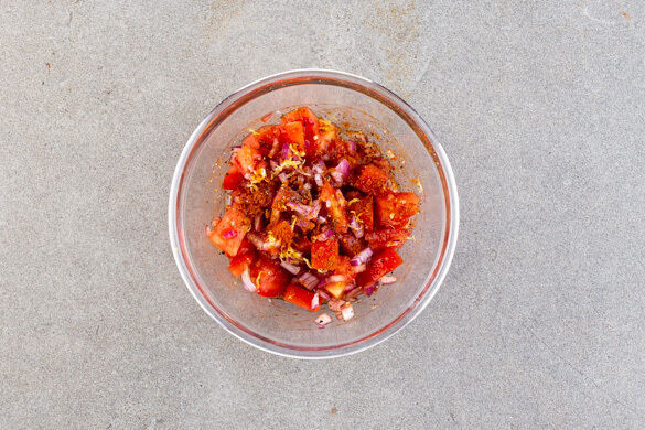 Die Tomaten in kleine Würfel schneiden. Die Zwiebel schälen, halbieren und fein würfeln. Die Tomaten und die ½ der Zwiebeln oder nach Geschmack mehr mit der restlichen Gewürzmischung, 1EL Ketchup und 1TL Zitronenschale vermengen und die Salsa mit Salz und Pfeffer abschmecken.